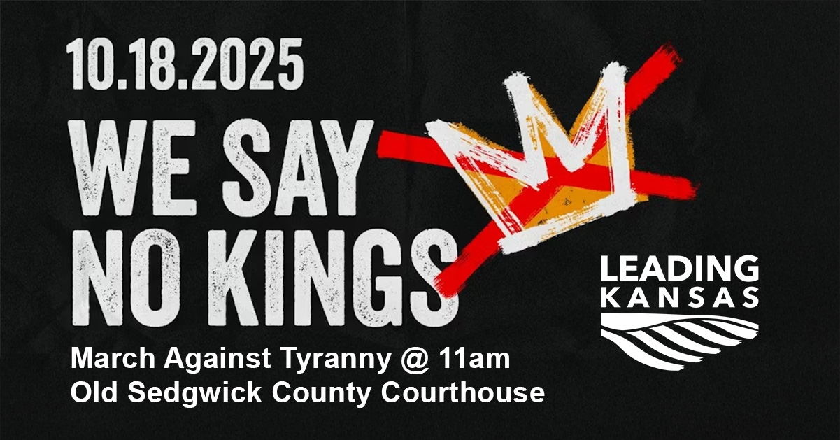 October 18 @ 11:00 am - 2:00 pm No Kings Day March Against Tyranny! Historic Sedgwick County Courthouse 510 N Main Street, Wichita, KS, United States Register online here! https://mobilize.us/s/w7CnWi